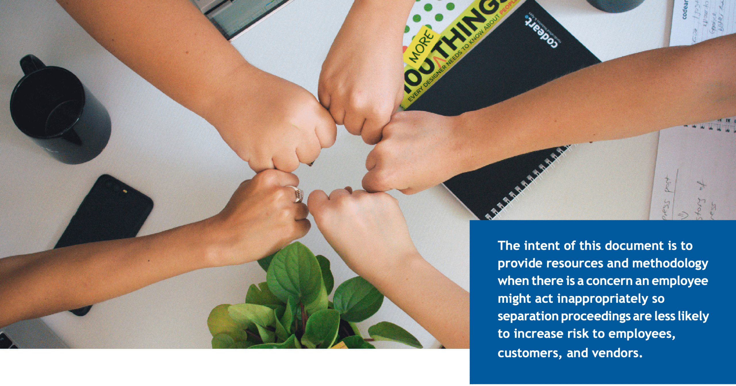 The following guidance for employment separations is made free for use and combines the thought leadership of multiple people from the Association of Threat Assessment Professionals (ATAP) This guide is an employer’s person-centric tool to manage and mitigate behavioral risk concerns before, during, and after the involuntary separation of an employee As such, a link to download this document in Word format is provided for customization to your respective environment.