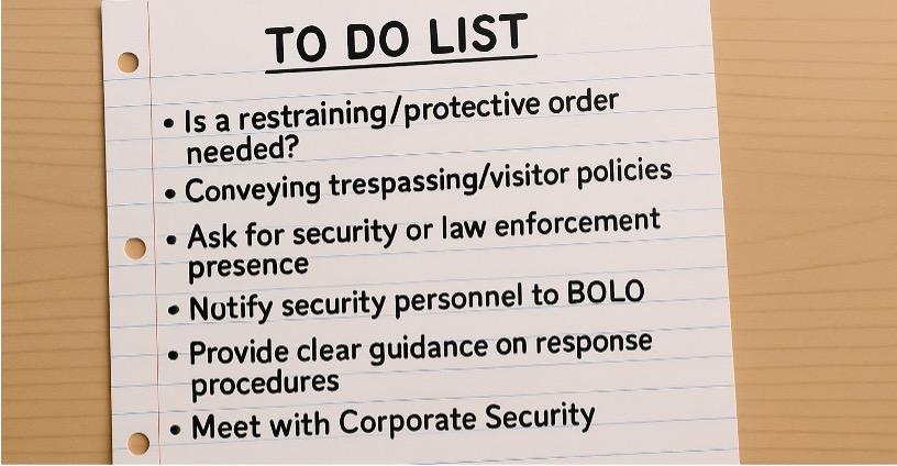 ☐ Plan to coordinate with Labor Relations, Human Resources, Corporate Security, and Legal, because even a suspension with pay may trigger the person to act out.